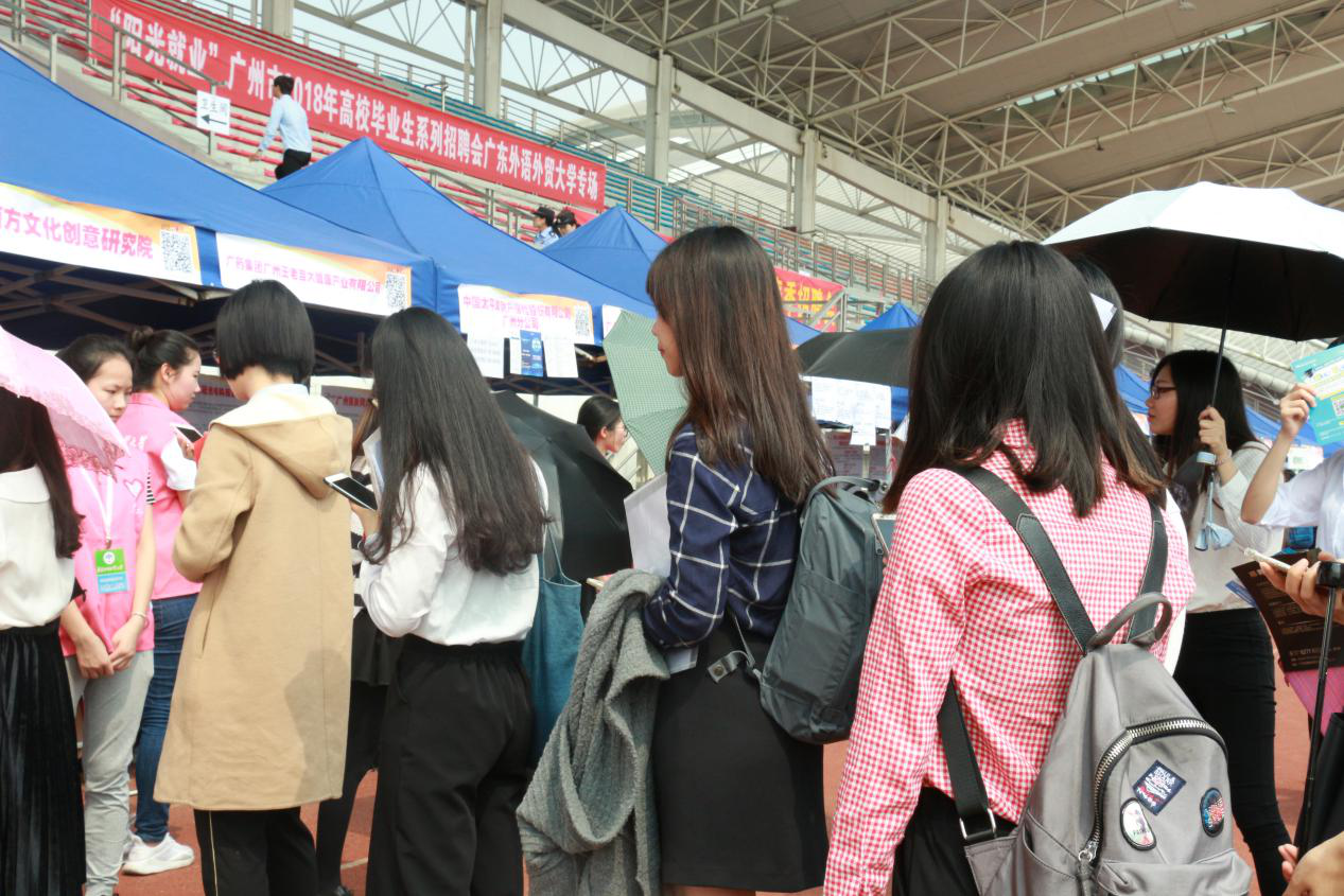 本网讯 4月1日,广州市“阳光就业”高校毕业生招聘会(广东外语外贸大学专场)在我校南校区田径场举行。当日广州的气温便“扶摇直上”,直逼30摄氏度,但燥热的天气也难挡毕业生们追梦的步伐与用人单位招贤纳士的心。此次招聘会共有200多家用人单位到场揽才,其中包括广药集团、广发证券、中国人寿保险、蓝月亮、唯品会等大型企业,吸引了众多我校以及外校的毕业生前来应聘。