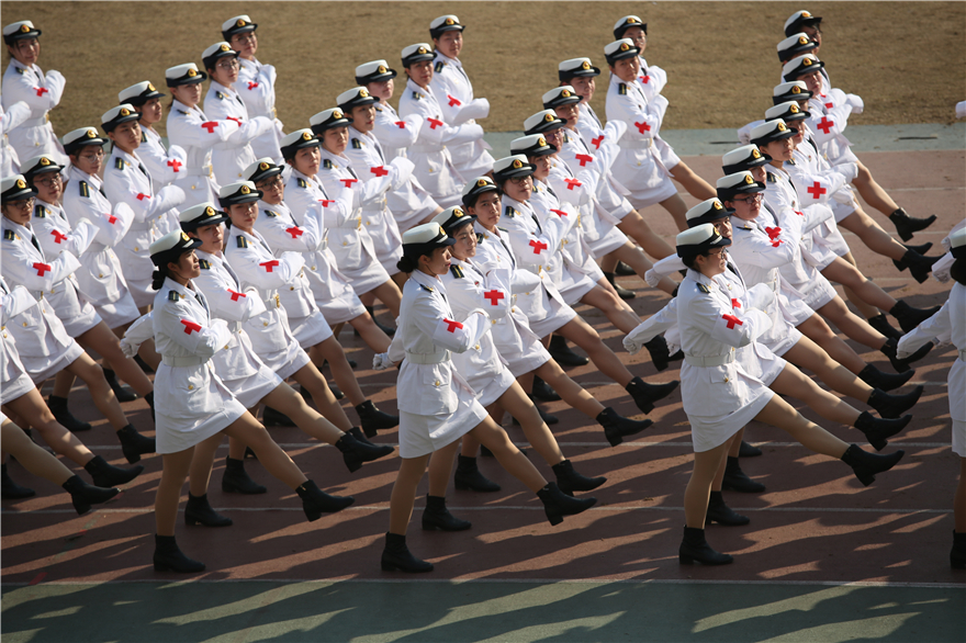 分列式表演方阵个个神采奕奕,英姿焕发,步伐铿锵有力,动作整齐划一,响亮的口号势破云霄。清一色白色制服的海军持枪方阵、蓝天一色的空军方阵、红裙白鞋的女子民兵方队、消防员方阵和迷彩服方阵也迈着整齐的步伐依次接受检阅。他们以最饱满的状态展示广外学子的别样风采,凸显广外的昂扬进取精神。