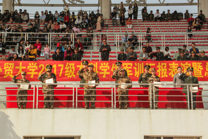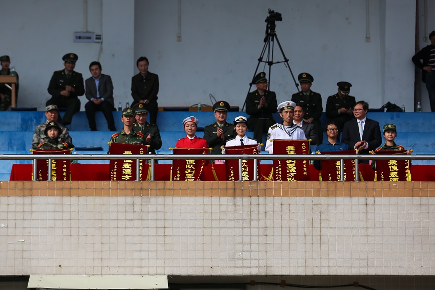 出席大会的还有广州市番禺国防教育训练基地训练部副主任李秀平,以及我校军训工作领导小组成员、各部处、各学院的领导和老师们。我校军训旅政委、武装部部长何越晖和军训旅政委、学生工作部部长谢应东分别主持了南北校区的汇演。