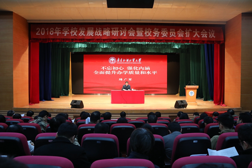 本网讯 1月11日,2018年学校发展战略研讨会暨校务委员会扩大会议在北校区六教报告厅举行。校党委书记、校长隋广军以《不忘初心 强化内涵 全面提升办学质量和水平》为题做主题报告,分析学校所处发展阶段和面临的内外形势,强调提升办学质量,聚焦发展重点、明确工作抓手。校领导,校务委员,校学术委员会委员,全校副处职(级)以上干部、附属单位主要负责人,系(部)主任及各教学、科研、教辅单位办公室主任和党政群部门科长等参与会议。