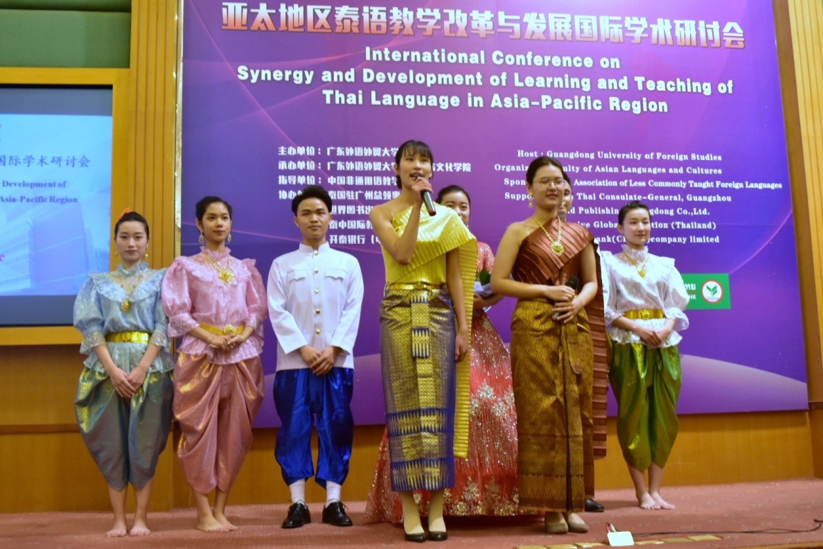 闭幕式上,我校泰语系学生为各位来宾献上一组特别节目:泰国长鼓舞、泰语“百花歌”、泰国知名动画片《小战象》配音表演、泰语传统唱本《昆昌昆平》选段以及用中泰双语演唱的《难忘今宵》,这是我校泰语系的优秀教学成果的展示,给与会专家学者带来耳目一新的享受,将此次研讨会的气氛推向高潮,同时也为研讨会划上了一个完美的句号。
