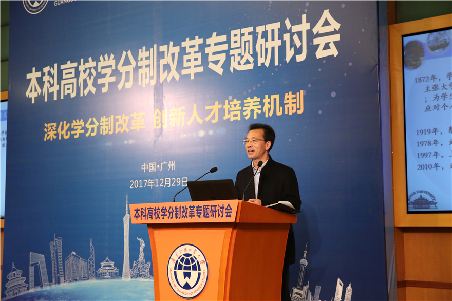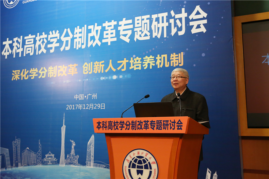 本网讯 2017年12月29日,本科高校学分制改革专题研讨会在我校国际会议厅举行。本次研讨会以“深化学分制改革,创新人才培养机制”为主题,旨在总结和交流学分制管理经验,探讨学分制改革面临的问题和应对策略。广东省教育厅党组副书记、副厅长魏中林,我校党委书记、校长隋广军,原北京大学副教务长、教师教学发展中心主任方新贵等有关部门领导、全国知名大学教育专家、全国外语院校教务处领导、广东省有关高校教务处领导、我校相关部门领导等40余所学校100余人出席会议。会议由副校长焦方太主持。