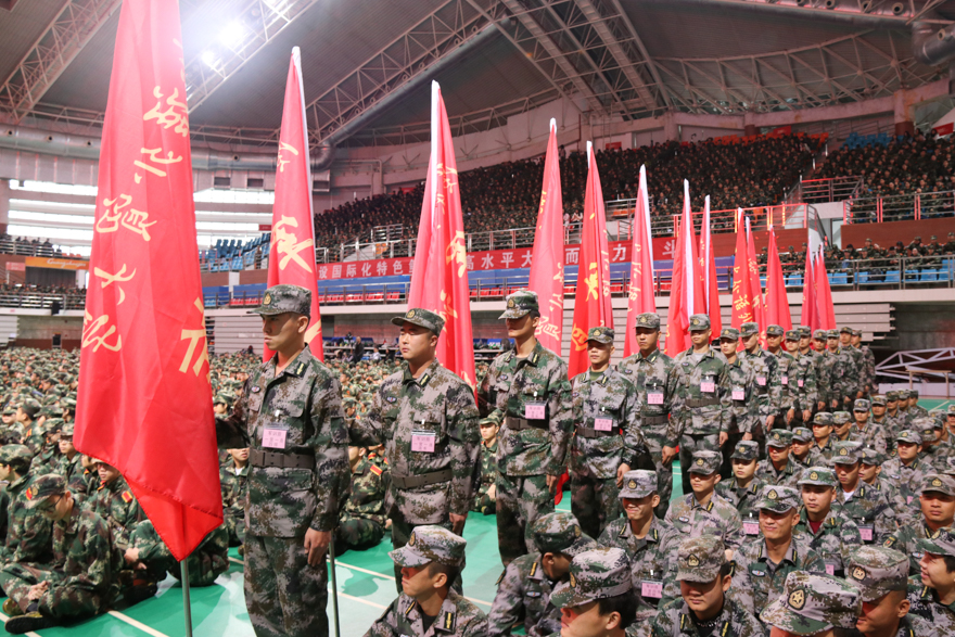 本网讯 1月6日,我校2017级军训动员大会分别在南北校区体育馆举行。本次国防教育和军事训练为期14天,是我校军训历史上首次在学期末、冬天军训。军训领导小组组长、校党委副书记李云明、副校长刘海春,番禺区国防教育训练基地副主任李秀平、黄光中,军训旅政委、武装部部长何越晖,全体教官以及各学院负责人、教师代表出席动员大会。