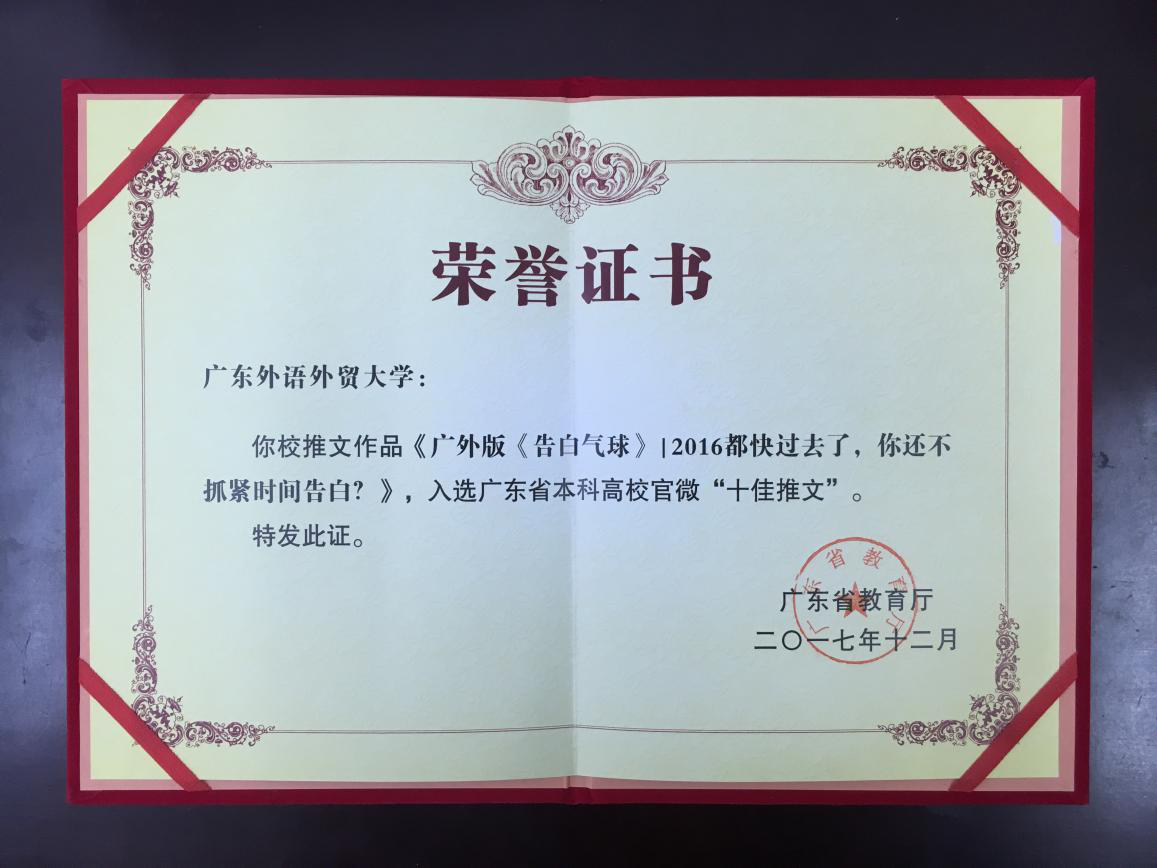 本网讯 12月22日,由省教育厅主办、广东工业大学承办的首届广东高校新媒体成果展示节开幕。开幕式上,省教育厅揭晓广东高校新媒体推文评选结果,我校官微推文作品《广外版< 告白气球>|2016都快过去了,你还不抓紧时间告白?》获广东省本科高校官微“十佳推文”第二名。我校党委宣传部部长、党委教师工作部部长胡文涛接受颁奖。