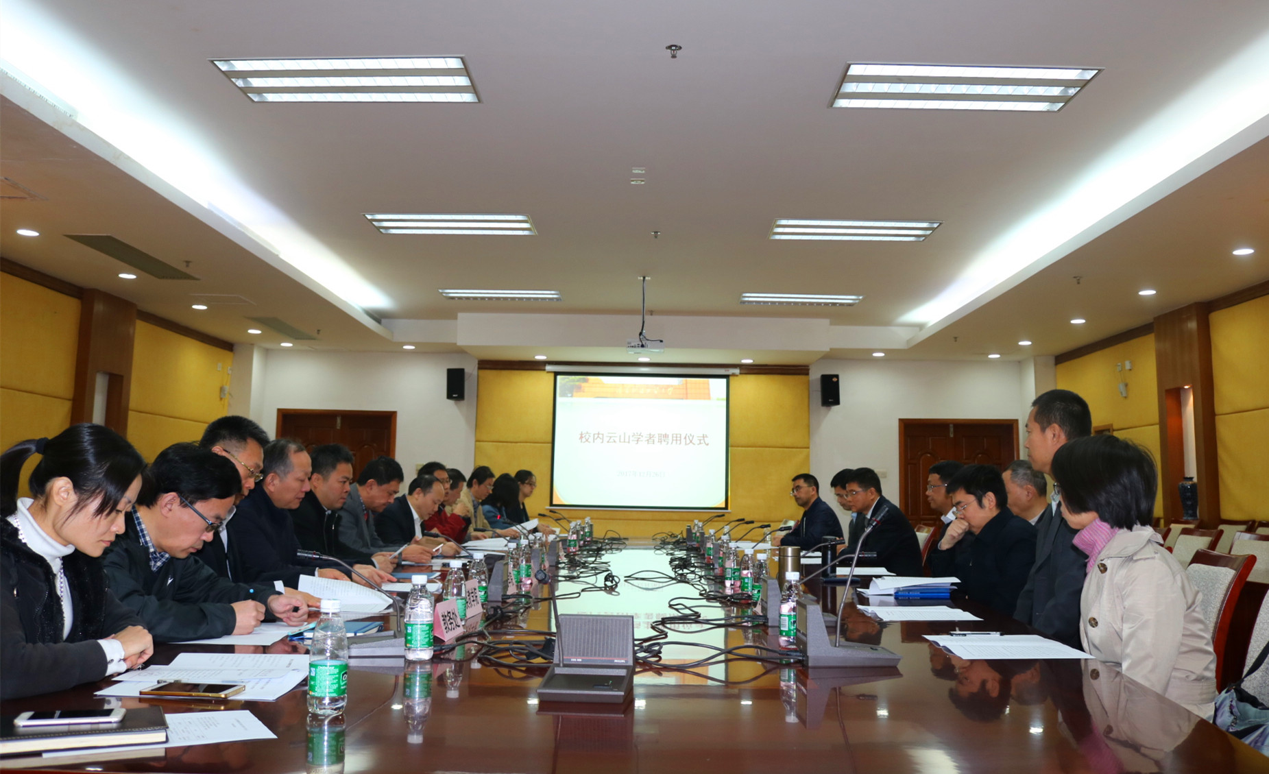 本网讯 12月26日上午,第二批校内教师受聘“云山学者”聘用仪式在南校区行政楼103会议室举行。我校党委书记、校长隋广军为10名教师颁发“云山学者”聘书,副校长阳爱民,发展规划处、教务处、科研处、人事处及相关二级单位负责人出席本次仪式。仪式由阳爱民主持。