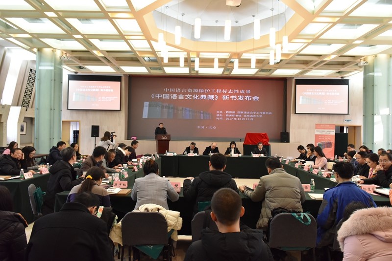 本网讯 12月15日,我校国家社科重大项目负责人、科研创新团队负责人中国语言文化学院教授严修鸿以及科研创新团队成员杨慧君分别作为第一作者编著的《中国语言文化典藏·连城》、《中国语言文化典藏·衡山》丛书在中国语言资源保护工程标志性成果《中国语言文化典藏》(20卷)发布会上发布。成果发布会由教育部、国家语言文字工作委员会主办,商务印书馆、北京语言大学承办。教育部语言文字应用管理司、语言文字信息管理司司长田立新,国家出版基金规划管理办公室副主任颜永刚,中国出版集团公司党组书记、中国出版传媒股份有限公司总经理王涛,商务印书馆总经理于殿利,中国语言资源保护研究中心主任曹志耘以及《中国语言文化典藏》编委会、作者等出席了会议。我校中国语言文化学院教师杨慧君作为编者代表发言。