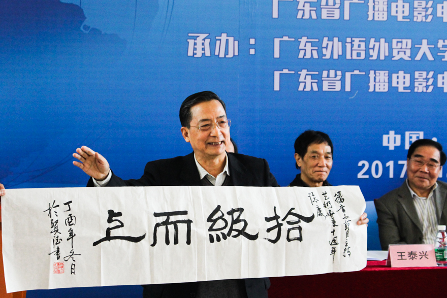 我校新闻学院教授於贤德致辞。他提出“凭借我校国际化人才在双语主持上的优势,向国际化的、立体型的培养出发,培养更多优秀人才”的建议。他还为播音与主持专业建立十周年献上墨宝“拾级而上”、“晖光日新”,期待我校播音主持专业跨越、发展与创新。