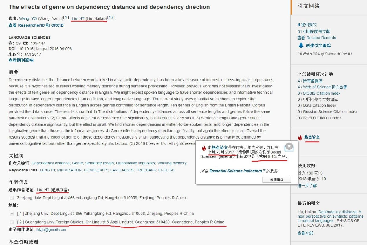 另一篇热点论文“The effects of genre on dependency distance and dependency direction”属于“社会科学”学科,刘海涛为通讯作者,论文发在语言学权威期刊Language Science上。