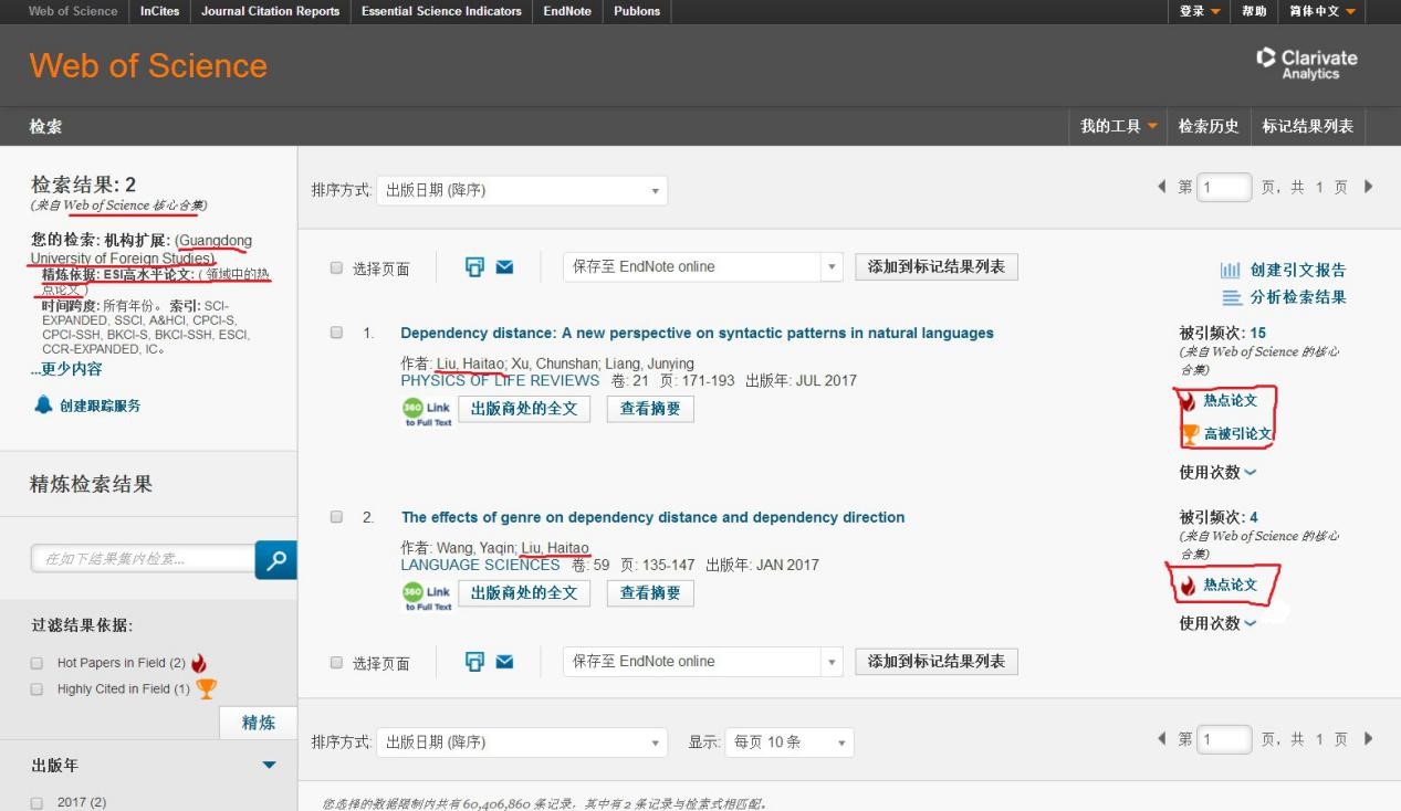 其中,以刘海涛为第一作者的热点论文“Dependency distance: a new perspective on syntactic patterns in natural languages”同时也是“高被引论文”(学科被引前1%),该文发表在Physics of Life Reviews上,该期刊2016年影响因子为13.84,在生物学(79种期刊)和生物物理学(65种期刊)两个领域均排名第一。此前我们对此文做过详细报道,详情可搜索“‘云山领军学者’刘海涛团队PLREV刊文:依存距离—自然语言句法模式的新视角” http://clal.gdufs.edu.cn/info/1034/3074.htm。