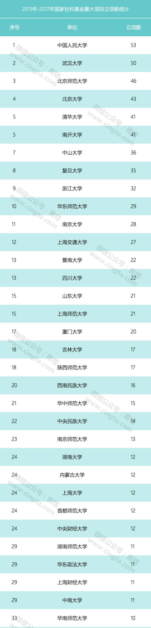 本网讯 近日,青塔微信公众号(cingta-com专业提供第三方高等教育数据服务)发布了2013年-2017年国家社科基金重大项目立项统计,我校共获得7个立项,在国内大学中位列第44,在全国外语类院校中排名第一。