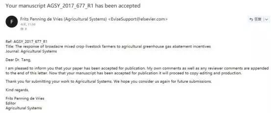 本网讯 近日,我校经贸学院云山青年学者唐凯博士作为第一作者和通讯作者的论文“The response of broadacre mixed crop-livestock farmers to agricultural greenhouse gas abatement incentives”被国际农业领域顶级刊物Agricultural Systems录用。合作者为澳大利亚西澳大学教授、环境生产力领域国际著名学者Atakelty Hailu,西澳大学Marit Kragt博士以及暨南大学经济系教授、珠江学者特聘教授马春波。这也是Agricultural Systems首次录用来自中国广东省学者的学术论文,实现了我校在国际顶级期刊发表论文的又一次突破。
