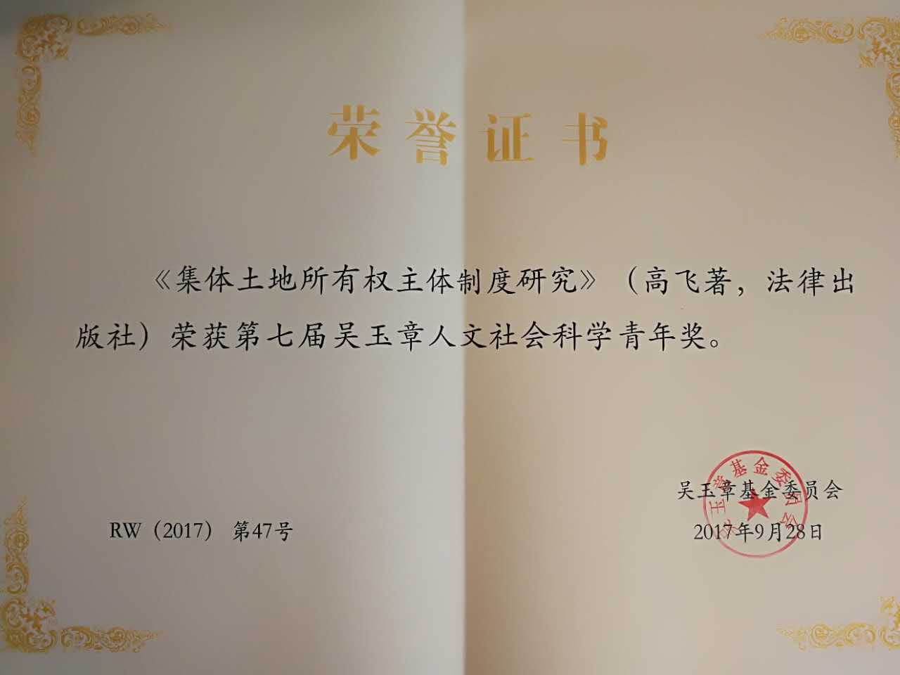 本网讯 9月28日,第七届吴玉章人文社会科学奖和第六届吴玉章人文社会科学终身成就奖在中国人民大学揭晓。我校云山青年学者、土地法制研究院副院长高飞的著作《集体土地所有权主体制度研究》(法律出版社2012年版)一书荣获第七届吴玉章人文社会科学青年奖(法学类唯一)。高飞教授此次获奖是我校在人文社科领域所获奖项的又一突破。中共中央政治局委员、国务院副总理、吴玉章基金委员会主任马凯为获奖者颁奖并讲话。