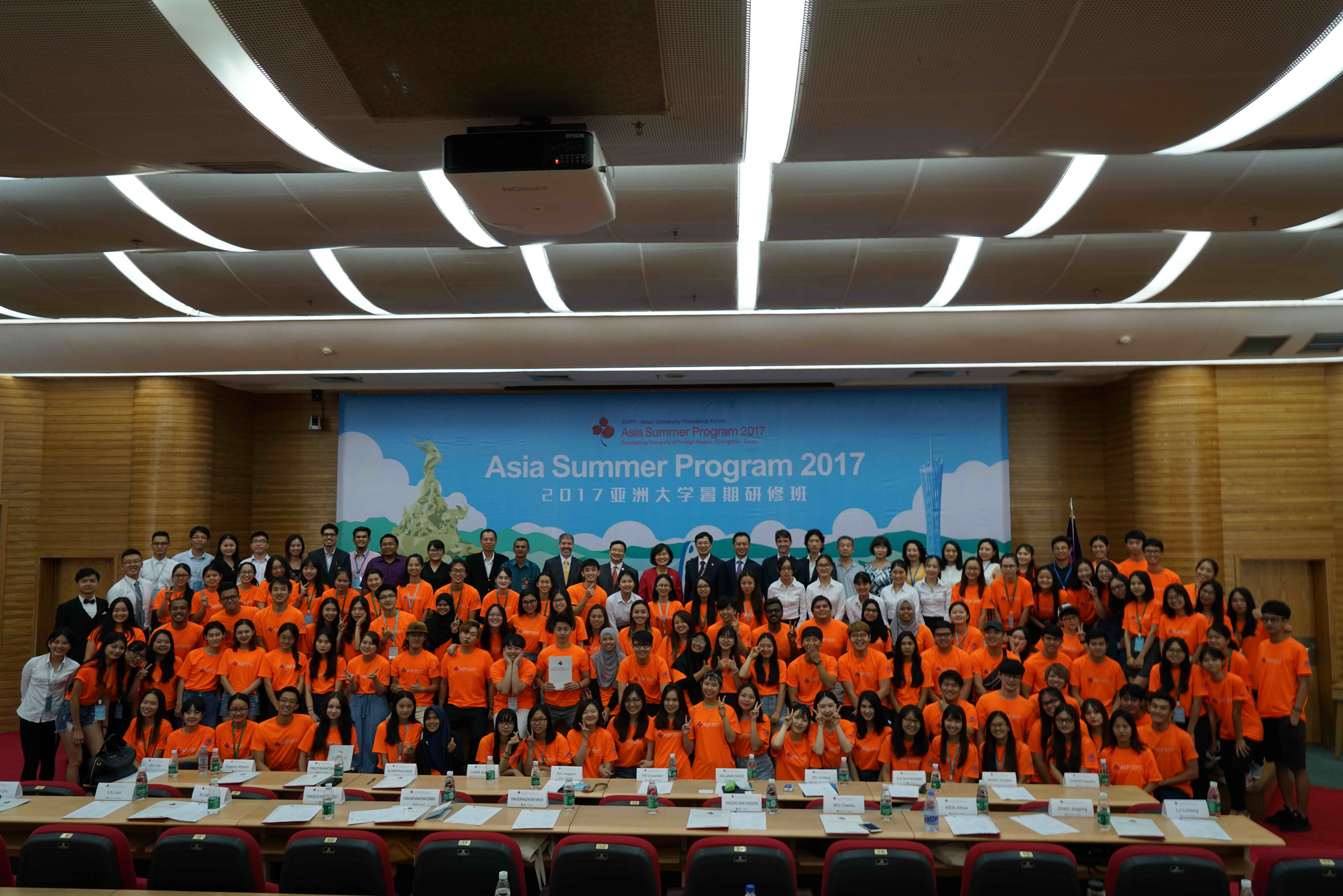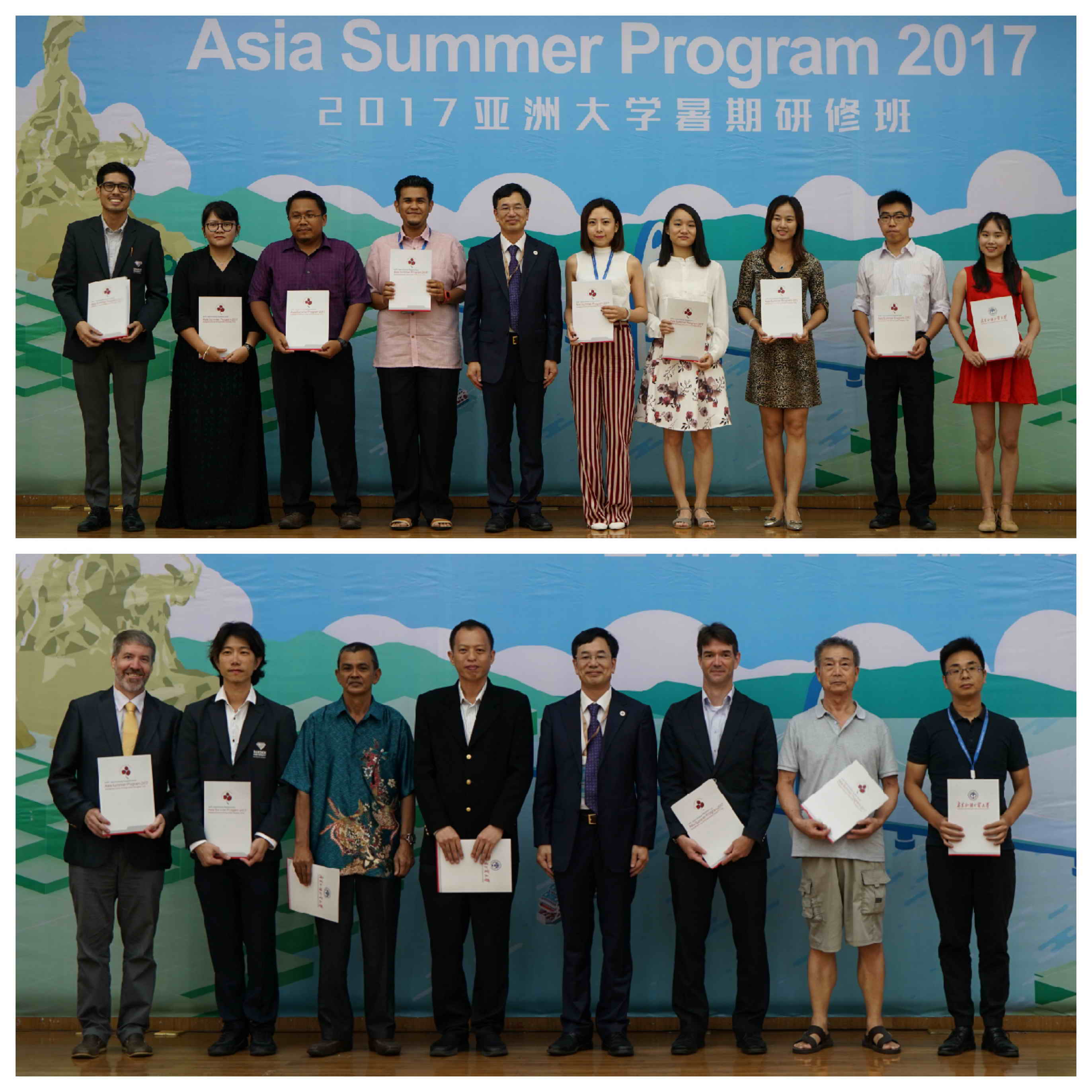 本网讯 8月20日下午,2017亚洲大学暑期研修班(Asia Summer Program 2017,简称ASP2017)结业典礼于我校北校区图书馆负一层报告厅举行。我校副校长何传添,韩国东西大学副校长金静藓(KIM JUNGSUN),我校留学生教育学院院长梁学宏、国际合作与交流处副处长吴俊峰等及全体研修班师生出席了结业典礼。