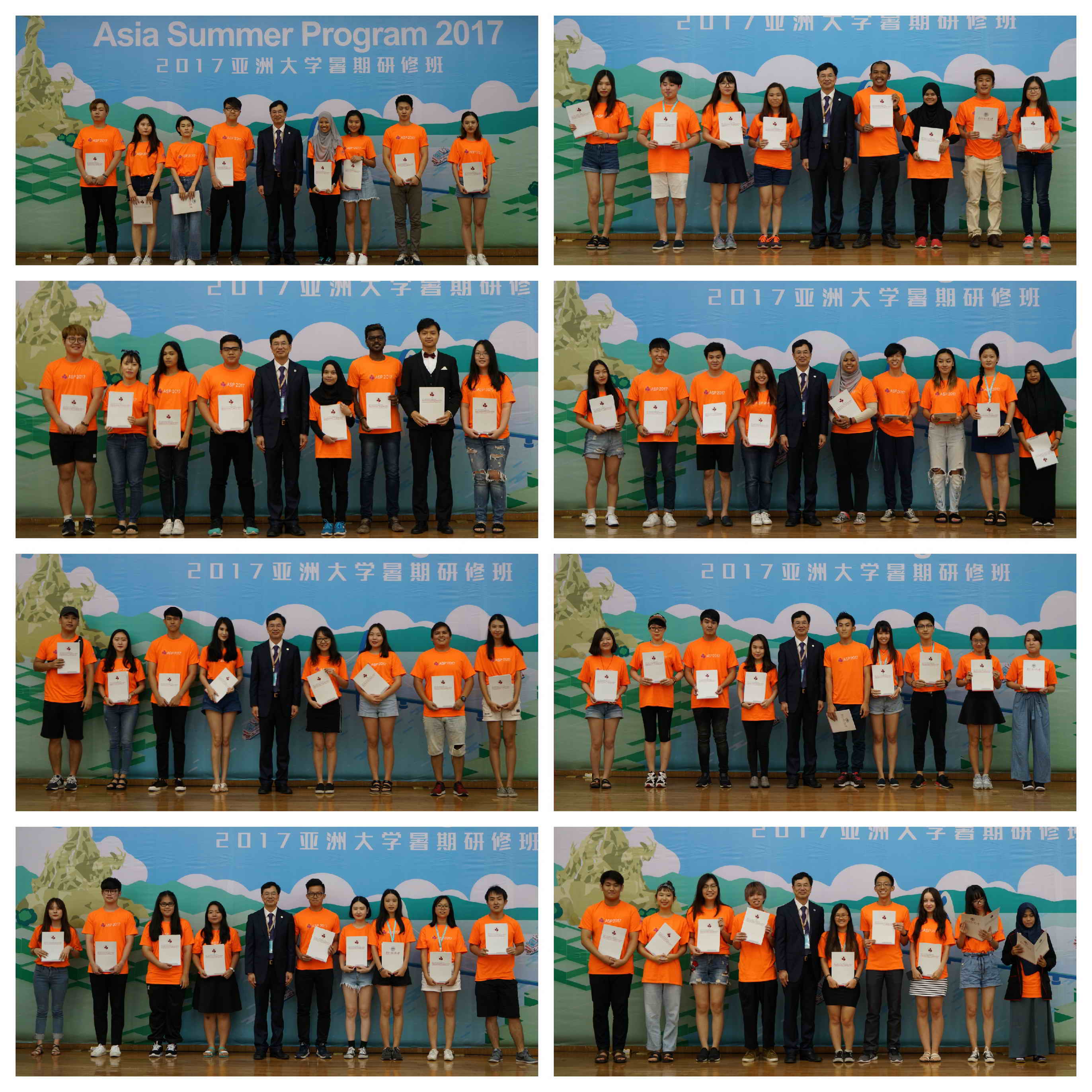 何传添为研修班老师、学员与志愿者颁发证书。全体人员一通观看2017年亚洲大学暑期研修班回顾视频。