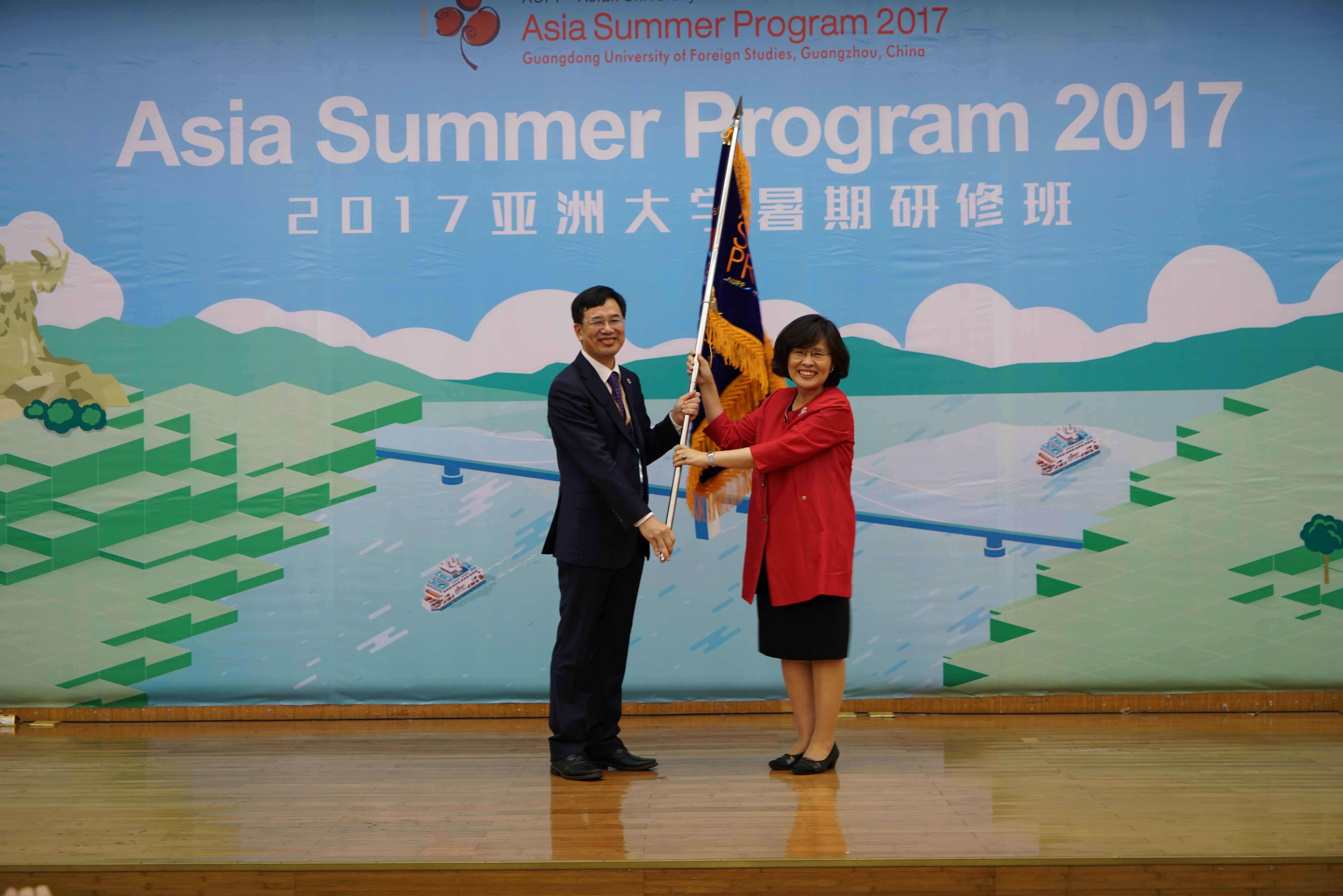在交接仪式上,何传添授予金静藓研修班班旗。韩国东西大学正式成为2018亚洲大学暑期研修班的主办单位。