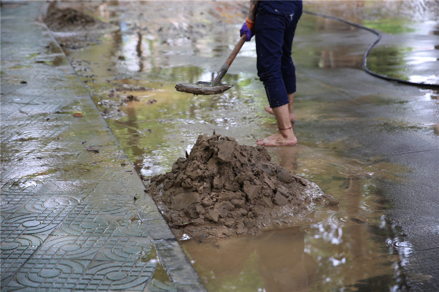 工作人员正在清理校道上的淤泥