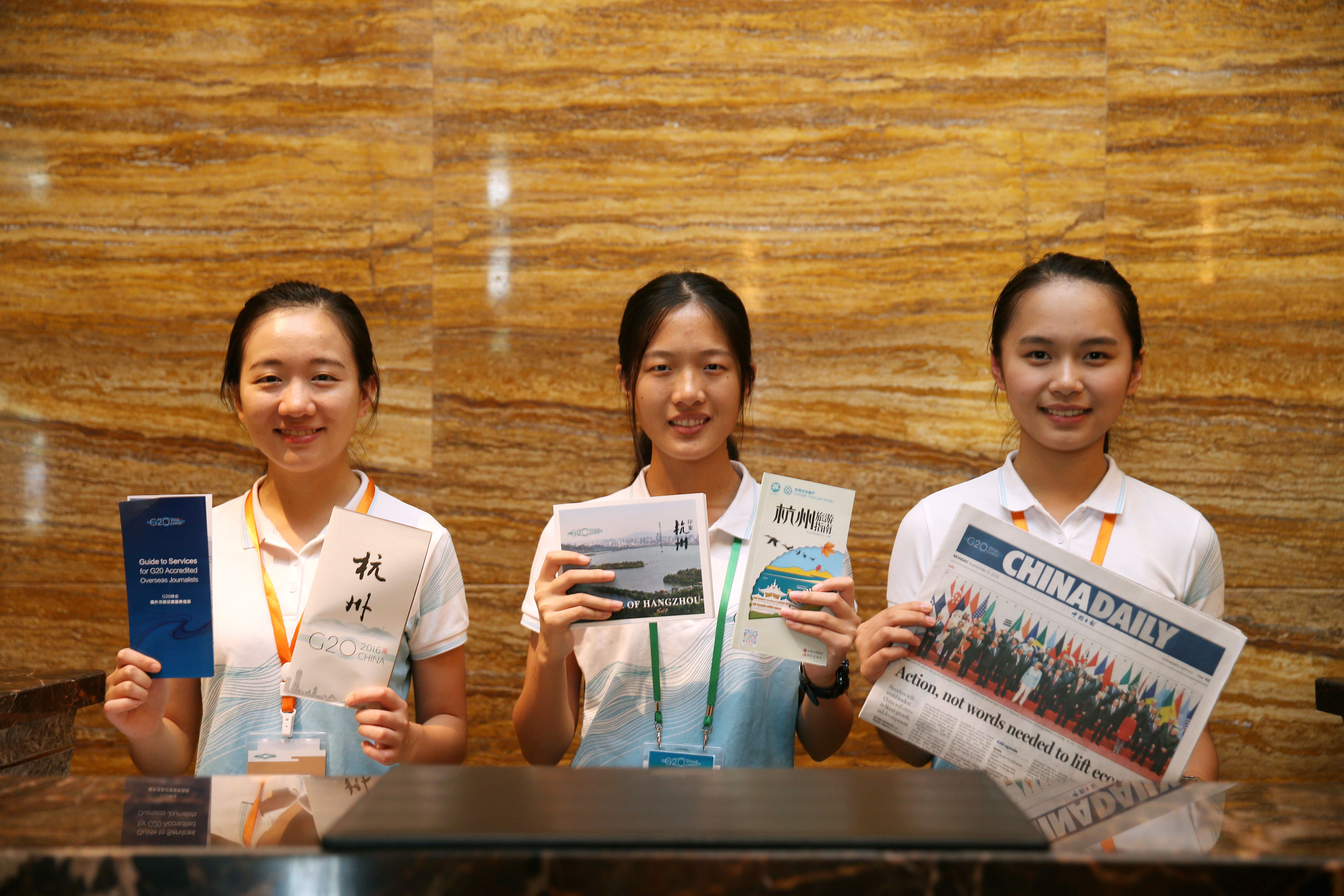 2016年杭州G20峰会期间,在那群身着蓝白相间套装,被国人亲切称为“小青荷”的志愿者中,也有广外学子的身影。广外15级葡语系王玥同学就是“小青荷”之一,她负责接待境外注册记者,嘉宾主要来自英、法、德、加、西、日、韩、巴等国。“大一时就能参加这么重要的外事活动真的很难得,而且能凭自己所学,为外国记者提供帮助,虽然每天都很累,但是很充实。”王玥同学以自信从容的微笑、不卑不亢的态度和专业流利的外语迎接G20峰会来宾,展现出一名具有国际化视野学子的风采。
