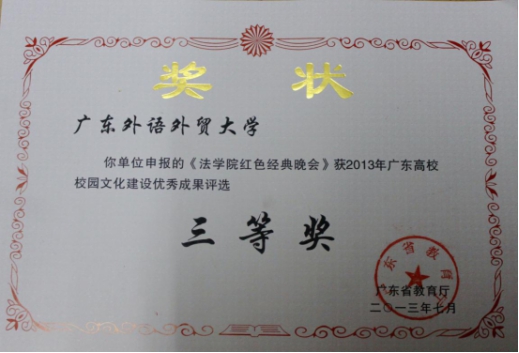 ●两个品牌活动:红色经典晚会荣获2013年广东省高校校园文化建设优秀成果三等奖,法律援助中心荣获广东省首批学雷锋活动示范点。