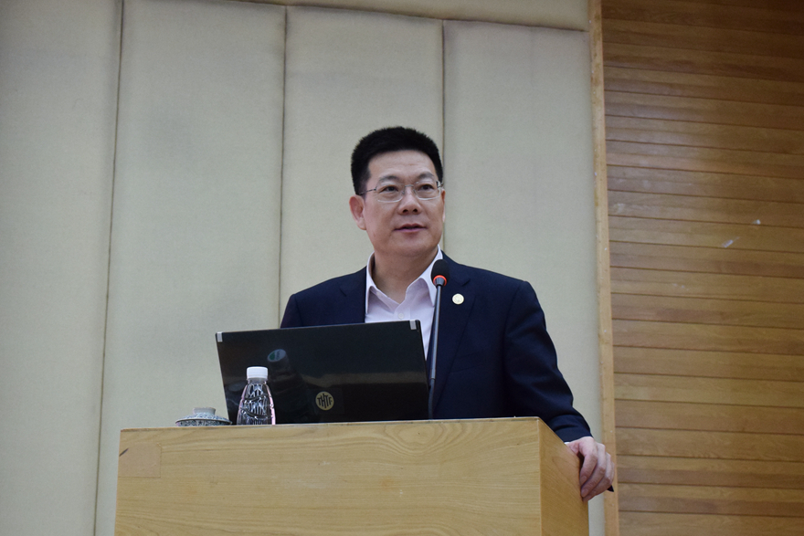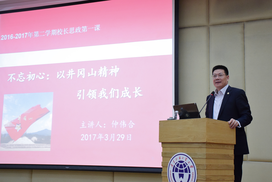 本网讯 3月29日上午,我校校长仲伟合为来自英文学院、商英学院、东语学院、西语学院和中文学院的200多名本科生讲授本学期第一堂思想政治教育课,主题为“不忘初心:井冈山精神引领我们成长”。仲伟合从井冈山革命根据地的创建与发展、井冈山精神的深刻内涵、井冈山精神的时代价值三方面全面解读井冈山精神。