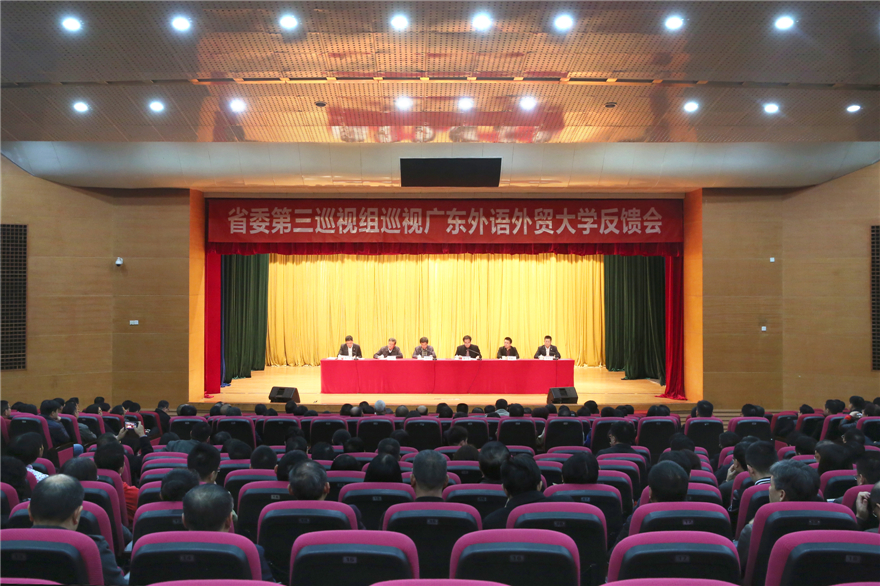 本网讯 根据省委巡视工作领导小组的部署,2017年3月1日,省委第三巡视组向广东外语外贸大学党委反馈巡视情况。省委第三巡视组副组长龚礼雄代表省委第三巡视组分别向校党委书记隋广军同志和广东外语外贸大学党委领导班子反馈巡视情况。省委巡视办副主任项天保同志对巡视整改工作提出要求。校党委书记隋广军同志作表态发言,校长仲伟合同志主持反馈会议。省教育厅副厅长、党组副书记魏中林同志,省委第三巡视组副组长高朝仁同志以及省委第三巡视组全体成员出席会议。