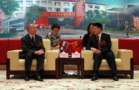 随后,我校领导与嘉宾一行在行政楼贵宾厅进行了会谈。会谈中,仲伟合强调,俄语中心在建设过程中得到了广东省委书记汪洋的高度关注,广外将利用好俄语中心这一平台。俄语中心不仅直接关系到俄语专业学生,而且与全校师生有着密切关系。他表示有信心将广外俄语中心办成全国最好的俄语中心,更好地服务于华南地区。