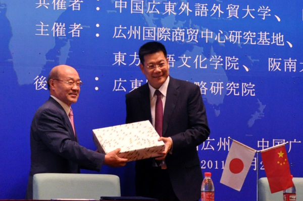 本网讯 4月25日下午,日本阪南大学校长辰巳浅嗣、企业情报研究科科长安井恒则、前企业情报研究科科长大田一广、国际交流科科长田中一郎、经济学部部长石井雄二、流通学部部长洪诗鸿一行来访我校。我校校长仲伟合,副校长方凡泉,国际合作与交流处处长焦方太、副处长吴俊峰,经贸学院院长李铁立,东语学院院长陈多友、粤商研究中心主任申明浩等相关人员在北校迎宾厅接待了来宾。随后,双方在北校国际会议厅举办了中日经济论坛。此次论坛由两校主办,广州国际商贸研究中心,我校经贸学院、东语学院共同承办。