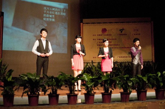 我校新闻学院播音与主持专业的学子们也为在场观众展示了自己的风采。08级播主专业的郭宇超等四位同学激情澎湃地朗诵了诗歌《圆》;09级播主专业钟严等同学展示了红色诗组朗诵《永不退色的记忆》;而08级和10级播主专业王骁等朗诵了《扬亚运精神 我们再出发》,激情洋溢地展现了广外学子昂扬的精神风貌。