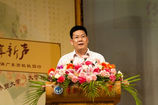 仲伟合在致辞时对广东电视台举办此次活动给予了高度肯定和大力支持。他提到,这次朗诵会同时也是我校第八届校园文化艺术节系列活动的重要组成部分,是广外学子领略主播魅力,欣赏高雅艺术,提高审美素质,培养艺术欣赏力的难得机会。