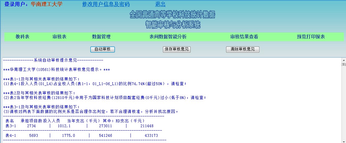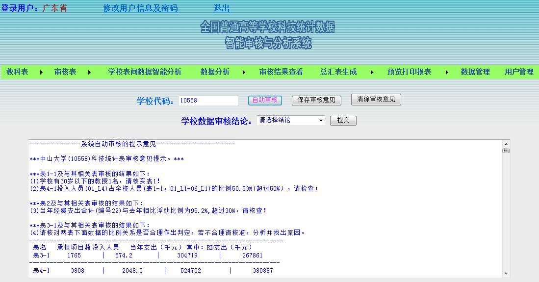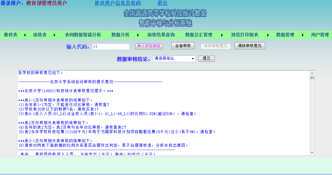 由我校科研处研发的“全国普通高等学校科技统计数据智能审核与分析系统”首次应用到全国普通高等学校的科技统计数据审核工作中,系统提供快捷智能的数据审核和分析功能。一个省60多个高校科研数据,从数据上传到校验、审核,只需要不到一分钟的时间即可完成自动审核。该系统的使用大大提高数据审核效率和质量,得到了与会教育部领导、科技统计专家组成员的高度认可。此前已有10多个省市的高校使用了该系统。