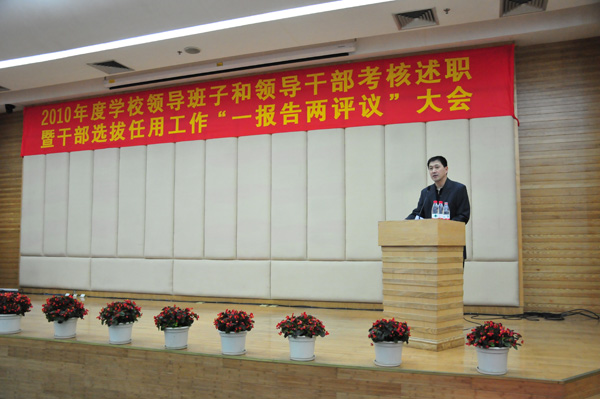 本网讯 3月10日下午,我校2010年度学校领导班子和领导干部考核述职暨干部选拔任用工作“一报告两评议”大会在北校区图书馆负一层报告厅举行。全体校领导,党委委员,校纪委委员,正副处级干部,各级人大代表,政协委员,各民主党派和侨联会负责人,离退休人员代表等参加会议。会议由校党委书记隋广军主持。