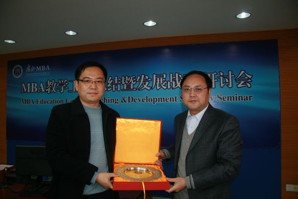 本网讯 1月19日下午, 我校2010年下学期MBA教学工作总结暨发展战略研讨会在北校区六教A301举行。前党委书记、校长徐真华、副校长石佑启、陈德萍、研究生处处长袁泉、商英学院院长郭桂杭、管理学院院长钟育赣、财经学院院长陈伟光、MBA教育中心主任孟庆轩、MBA任课老师和论文指导老师代表和中国人民大学研究生院常务副院长﹑我校客座教授徐二明等出席会议。会议由MBA教育中心执行主任孙建军主持。