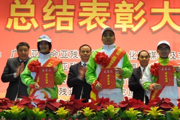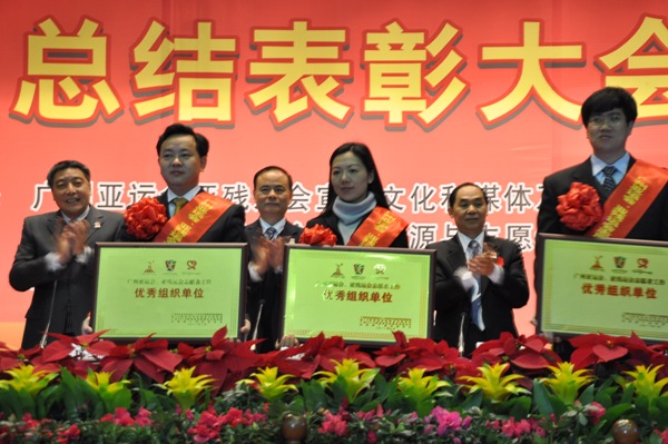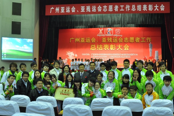 在大会上,王焕清对广州亚运会、亚残运会志愿者服务工作作出了总结,对志愿者表示出高度的评价。接着,方璇宣读了《关于广州亚运会、亚残运会志愿者工作先进集体和先进个人表彰决定》,由各与会领导为获奖的先进组织和先进个人代表颁奖。我校因在亚运会亚残运会的志愿服务工作及文明观众组织工作中表现突出,荣获“广州亚运会、亚残运会志愿者工作优秀组织单位”、“广州亚运会、亚残运会文明观众组织工作优秀组织单位”两项殊荣;我校团委被评为“创先争优主题实践活动先进集体”;学校组织的亚运专题教育项目被评为“广州亚运会、亚残运会志愿者工作优秀项目”; 38名老师获“广州亚运会、亚残运会志愿者工作贡献奖”、“志愿者工作先进个人”、“创先争优主题实践活动先进个人”等奖项, 406名赛会和城市志愿者、亚运会闭幕式与亚残运会开幕式演员被评为“广州亚运会、亚残运会志愿者先进个人”、“创先争优主题实践活动先进个人”。