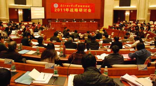 本网讯 1月16-17日,南国商学院举行2011年战略研讨会。会议对《广东外语外贸大学南国商学院教育事业“十二五”发展规划》(征求意见稿)进行了深入、热烈的讨论。广外党委书记隋广军出席了研讨会,并作重要讲话。广外副校长兼学院院长刘建达、学院领导和顾问、各部门负责人和科级以上干部出席了会议。