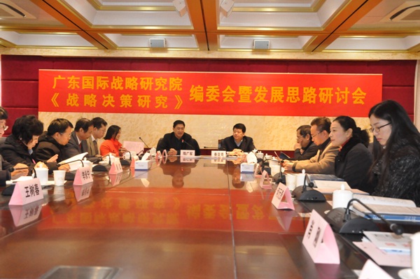 1月15日,广东国际战略研究院召开了《战略决策研究》编委会暨发展思路研讨会,就研究院的学术和政策研究刊物的办刊历程,成效与难点,未来发展方向等问题展开了深入讨论。广东外语外贸大学党委书记,国际战略研究院常务副院长隋广军教授致辞并为《国际问题研究》主编郭宪纲教授颁发了国际战略研究院特约研究员聘书,国际战略研究院秘书长李青教授主持了会议。来自北京的外交学院的党委书记秦亚青教授,国际问题研究所《国际问题研究》主编郭宪纲教授,外交学院东亚研究中心魏玲主任,外交学院国际教育学院王燕院长,来自广州的《开放时代》主编吴重庆研究员,以及本校宣传部、《国际经贸探索》、财经学院、国际工商管理学院、国际经济贸易学院、法学院、欧洲研究中心,美国研究中心的领导专家,国际战略研究院全体研究人员出席了研讨会。