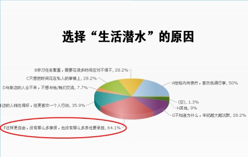 无独有偶,这份主要针对我校在校大学生的调查显示,约62%的同学在生活中“潜水”。其中,64%的同学表示喜欢潜水的原因是想要得到“更多的自由”,少承担一些责任和省去一些不必要的麻烦。