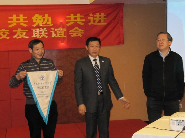 许国彬见证首届会长何继春和新任会长金一平移交会旗 新一任会长金一平诙谐幽默的讲话引起满堂欢笑。他以八个字总结了浙江校友会的宗旨“共聚、共享、共勉、共进”。希望校友们之间的相处真诚真挚,互帮互助,未来加强联系,常常聚会。