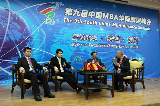 12月25日上午,第九届中国MBA华南联盟峰会高端论坛在我校顺利召开,此次峰会围绕“转型与创新”主题展开。出席此次峰会的外校嘉宾有中国与全球化研究中心主任王辉耀博士,中国出口信用保险公司资深专家陈连从总经理,中国MBA华南联盟理事会理事长王佐宁,广东商学院MBA教育中心常务副主任李焕荣,华南师范大学MBA教育中心副主任蒋峦。我校的嘉宾包括副校长石佑启,MBA教育中心主任孟庆轩、执行主任孙建军,MBA联合会主席钟杰军,广东国际战略研究院秘书长李青,《战略决策研究》杂志执行主编杨韶刚,管理学院教授钟育赣以及来自各个兄弟院校MBA联合会的代表200多人。此次峰会由孙建军主持。