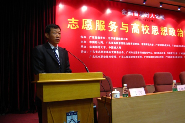 本网讯 12月25日上午,我校与中国好人网、广东省高校思想政治教育研究会、华南师范大学联合主办的全国首届“志愿服务与高校思想政治教育”好人论坛在华南师范大学国际会议厅举行。我校党委副书记许国彬出席并作主题演讲。出席本次论坛的还有政治与公共管理学院院长彭未名、党委书记范静静,校团委副书记谢秀兰以及政管学院部分教师和研究生。来自教育部、辽宁省教育工委、广东省教育厅、共青团广东省委和部分高校的领导、教师100余人参加了论坛。
