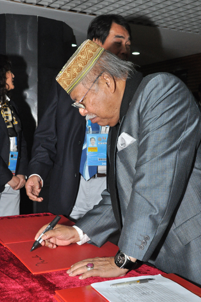 | 扎纳尔·阿布扎林在签名册上题字 |