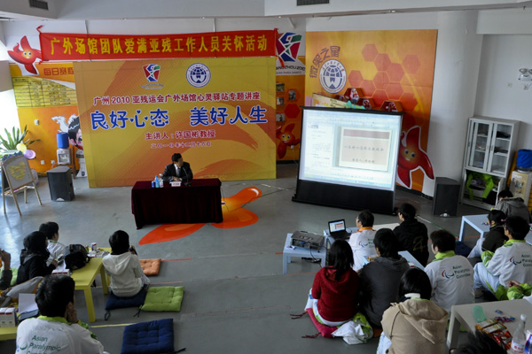 针对志愿者们在亚运和亚残运会中出现的心理问题,许国彬向在场的工作人员和志愿者讲授了一些保持良好心态的方法:学会自信,平衡心态;拓宽兴趣,憧憬未来;淡泊名利,宽以待人;调节情绪,忆乐忘忧;向人倾诉,寻求帮助。同时,他也提醒大家,在学习、工作与生活中要注意克服浮躁、嫉妒等不良的心态。
