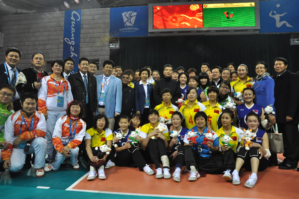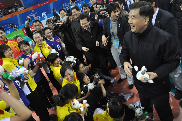随后,汪洋在隋广军和仲伟合的陪同下观看了女子坐式排球中国队对阵蒙古队的赛事。在激烈的比赛结束后,汪洋来到赛场上慰问残疾运动员们,向她们赠送可爱的吉祥物和纪念品,并勉励她们要在接下来的比赛中打出水平。仲伟合则在一旁用流利的英语给蒙古队的姑娘们做翻译。汪洋同时还盛赞在场的场馆志愿者和参与表演的我校“国魅”拉拉队队员,“你们代表了广外和整个广东对残疾人的关怀。” 他让大家认真总结经验,并祝愿大家“一生顺利”。