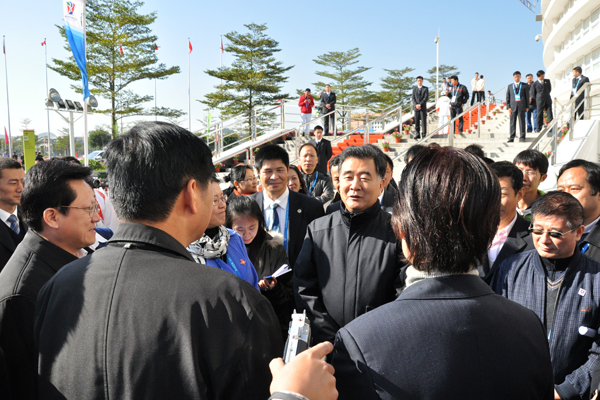 离开场馆之前,汪洋对我校校领导和场馆负责人说道:“在这么冷的天气下,场馆无论是运动员比赛的氛围、观众的热情还是整个内部的组织都非常的好,交出了一份文明的答卷。体现了广州文明的素养。在这里,人人都是东道主,人人都是形象,人人都是广东的窗口!”他希望我校场馆团队在冲刺阶段不要放弃,坚持到最后。校领导们也向汪洋承诺,广外场馆的赛事一定能顺利圆满地结束。