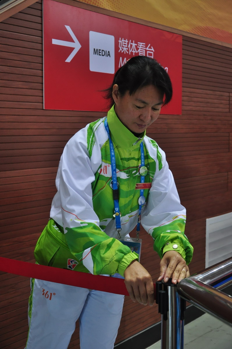 最后,她站起身来跟记者道别:“我要去站岗了。”随后黎燕雲来到她的工作岗位,站在媒体看台的入口,带着微笑,为进进出出的记者们服务。
