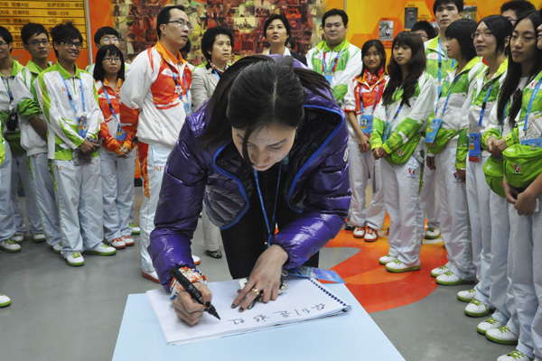 参观完志愿者之家后,林燕芬与谢杏芳分别为志愿者之家题词。在题词本上,林燕芬这样写道:“感谢你们辛勤的付出,亚残会有你们而更精彩。”而谢杏芳则写道:“你们是彩虹,你们是阳光,为广州亚运、亚残运会大放光芒。广外志愿者,加油!”