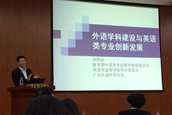 年10月10-11日,第十一届全国国际商务英语研讨会在山东烟台成功举行。本次研讨会由中国国际贸易学会国际商务英语研究会主办,山东工商学院承办,外语教学与研究出版社等单位协办。经大会理事会讨论,与会人员一致通过,我校校长仲伟合当选新一届中国国际商务英语研究会理事长,我校国际商务英语学院院长郭桂杭任副理事长兼秘书长。会上,我校16名师生代表与来自全国高校的400多名商务英语教学与研究领域的专家学者,围绕本次研讨会的主题“教学质量标准建设和商务英语专业人才培养”进行了深入探讨。仲伟合做了题为“外语学科建设与英语类专业创新发展”的主题发言。他首先介绍了外语学科概况、内涵与范畴,阐释了我国高等教育由英语专业到英语类专业变迁的历史背景、发展阶段、面临的问题、发展趋势,并以三份教学大纲为主线介绍了从英语到英语类(含英语、翻译和商务英语三专业)的现状,尤其着重强调了“新国标”对于英语类专业创新发展的指导和要求。从2007年全国第一个商务英语本科专业正式得到教育部批准设立,到目前已经有216所高校开设了商务英语专业。针对这一快速发展的现状,根据“新国标”,仲伟合在发言中详细介绍了商务英语专业的培养目标、商务英语人才知识与能力构成、课程设置、商务知识标准、教学原则、教学方法与手段,并提出了六条新的发展思路,得到了与会专家和学者的一致赞同和响应。