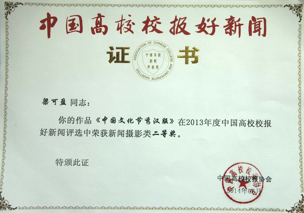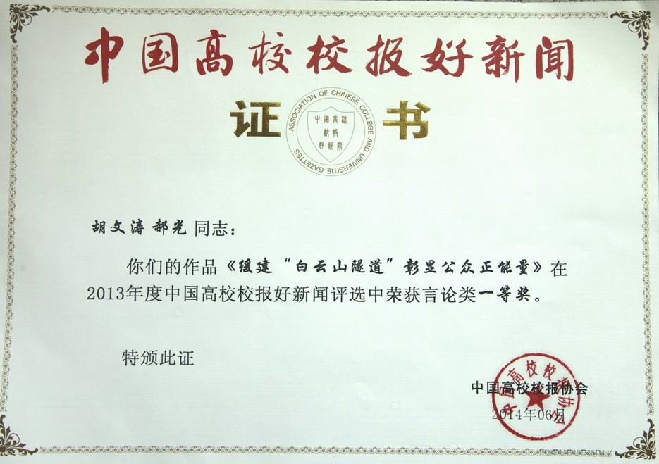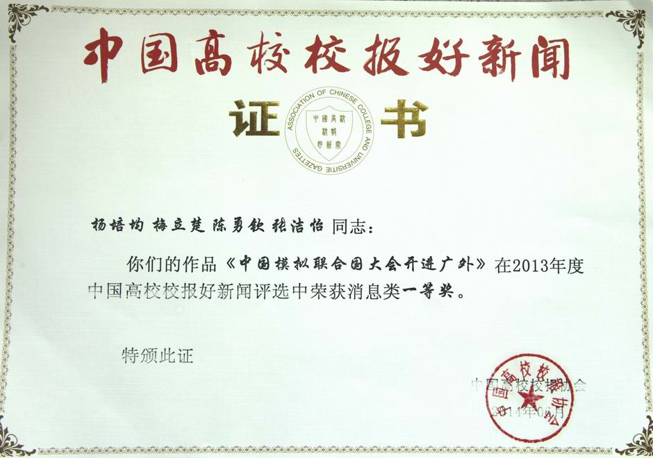 广外校报选送的消息类作品“中国模拟联合国大会开进广外”(作者:杨培均、梅立楚、陈勇钦、张洁怡)、言论类作品“缓建白云山隧道彰显公众正能量”(作者:胡文涛 郝光)、版面类作品“312期纪念岱诞辰110周年专版”(作者:贺静 李宛馨 张玲)分别获一等奖;新闻摄影类作品“中国文化节秀汉服”(作者:梁可盈)获二等奖。