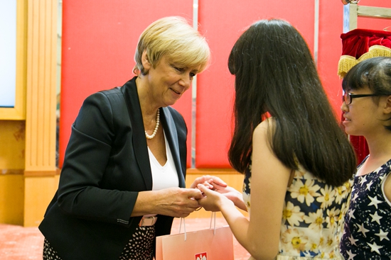 下午三点五十分,波兰代表团一行到访我校。达利雅与仲伟合在贵宾厅进行了亲切的交谈。仲伟合首先对波兰代表团的到来表示衷心的感谢,并表达希望通过开设波兰语这一新兴专业能够加强中波文化教育方面的交流。达利雅随后回应,开设一门语言专业,要达到在学习的基础上交流两国文化异同的目的。她希望能有更多的教师和学生参与中波大学交换合作项目。