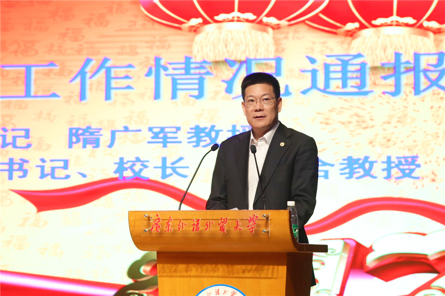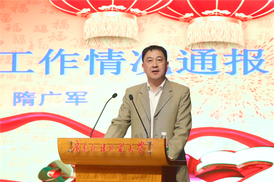 隋广军代表学校党政领导向离退休教工对学校建设和发展的关心和理解表示感谢。他提到,2016年是不平凡的一年,我校走过“十三五”开局年、改革关键年和丰收年,向社会交出了一份靓丽的成绩单。在国家政策改革的大背景下,全校上下同心同德,促使学校向前发展。他表示,学校获得进步,离不开每位老同志的建言献策与鼎力支持,接下来的“高水平”“双一流”建设中,我校既获得了机遇,也面临着挑战,希望各位离退休教职工一如既往关心学校的进步,团结一致,群策群力,共同推进学校各项事业蓬勃发展。