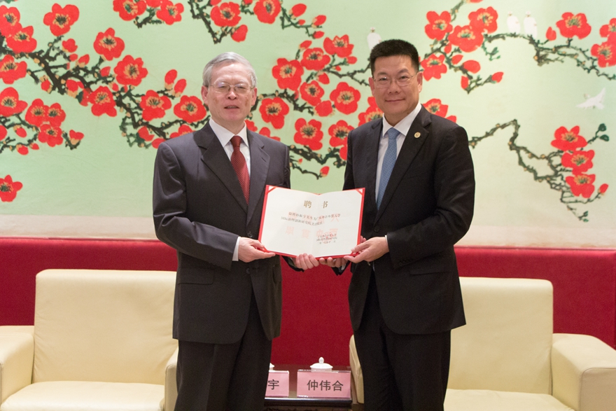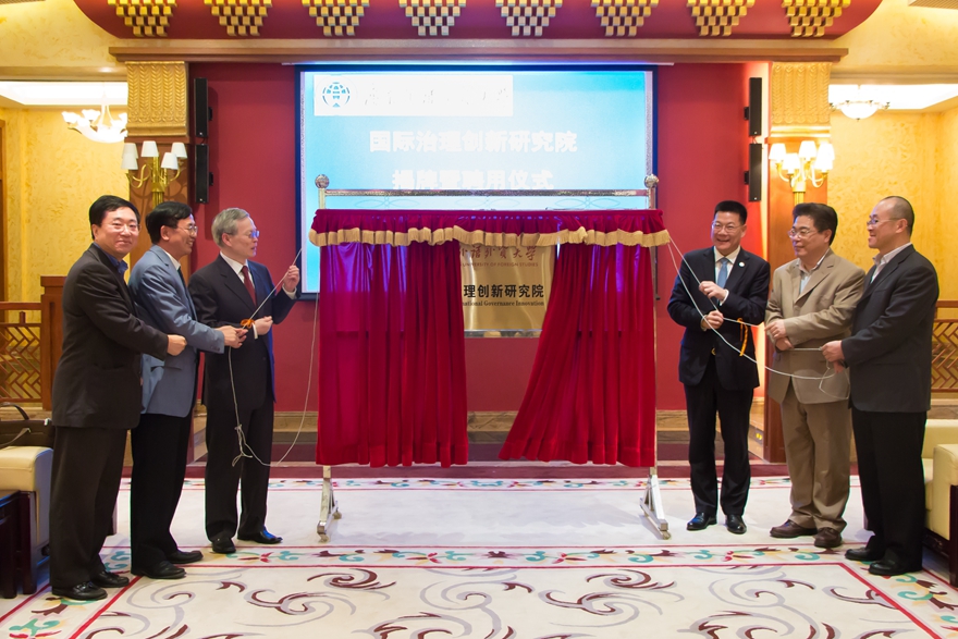 本网讯 12月1日,我校国际治理创新研究院揭牌仪式在我校北校区行政楼贵宾厅举行。我国WTO首任大使孙振宇、国家外国专家局中国国际人才交流基金会主任苏光明受聘为国际治理创新研究院客座教授。我校校长仲伟合、副校长何传添、国际合作与交流处处长蔡红、经济与贸易学院院长张建武、云山领军学者赵龙跃等出席仪式。仪式何传添主持。