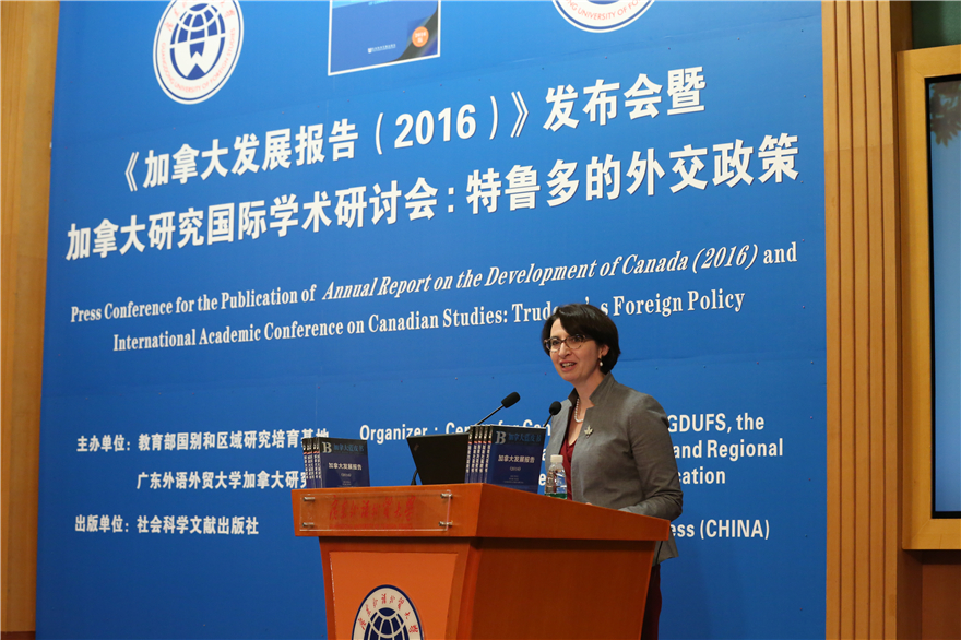 发布会由教育部国别和区域培育基地广东外语外贸大学加拿大研究中心与社会科学文献出版社共同举办,加拿大驻广州总领事馆总领事Rachael Bedlington、国际加拿大研究会长Susan Hodgett、中国加拿大研究会会长杜发春、社会科学文献出版社总编辑杨群、我校副校长阳爱民等出席。